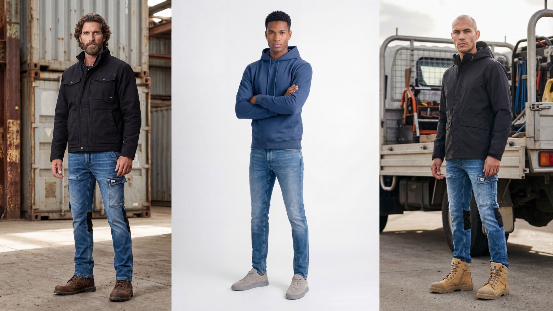 Prompt engineering is nauwelijks nog nodig. De 247Jeans structuur: vaste (gegenereerde) modellen, belichting (natural daylight, studio key light), achtergrond (white seamless, concrete urban) en camerahoek (frontal mid shot, 3/4 view).