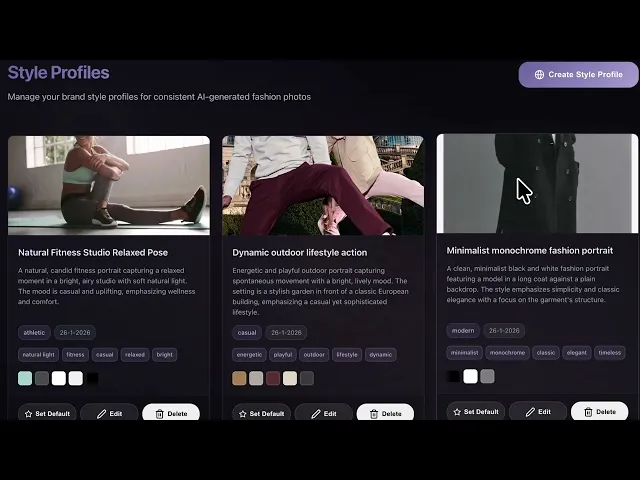Het krachtige zit in snelheid en variatie. Je hoeft niet opnieuw te fotograferen om een zomersetup te veranderen in een winterachtergrond. Upload je garment met meerdere hoeken (voorkant, zijkant, achterkant), zodat het kledingstuk in alle poses correct blijft. Maak collecties door meerdere items te combineren: volledige outfits stylen zonder nieuwe shoot.