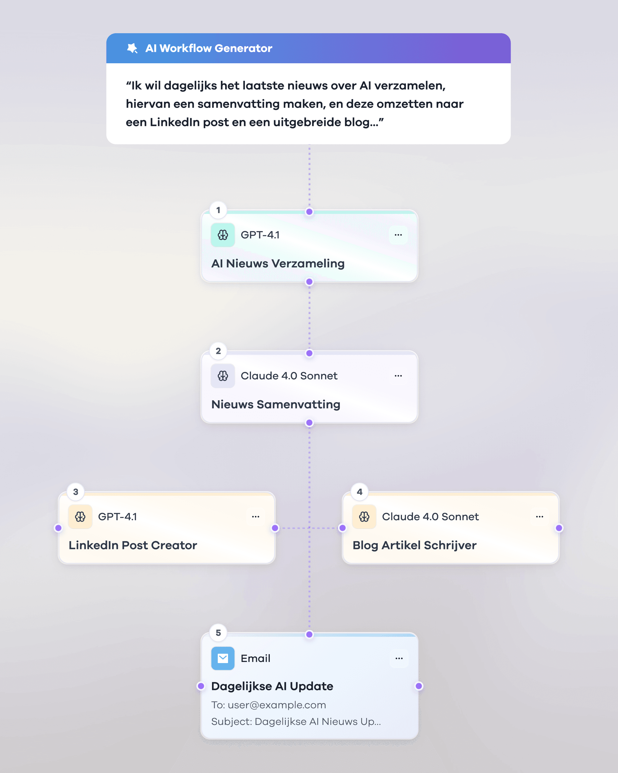 Met onze slimme Workflow Builder bouw je moeiteloos complexe AI workflows om taken uit te voeren, meteen of op een geplande interval.