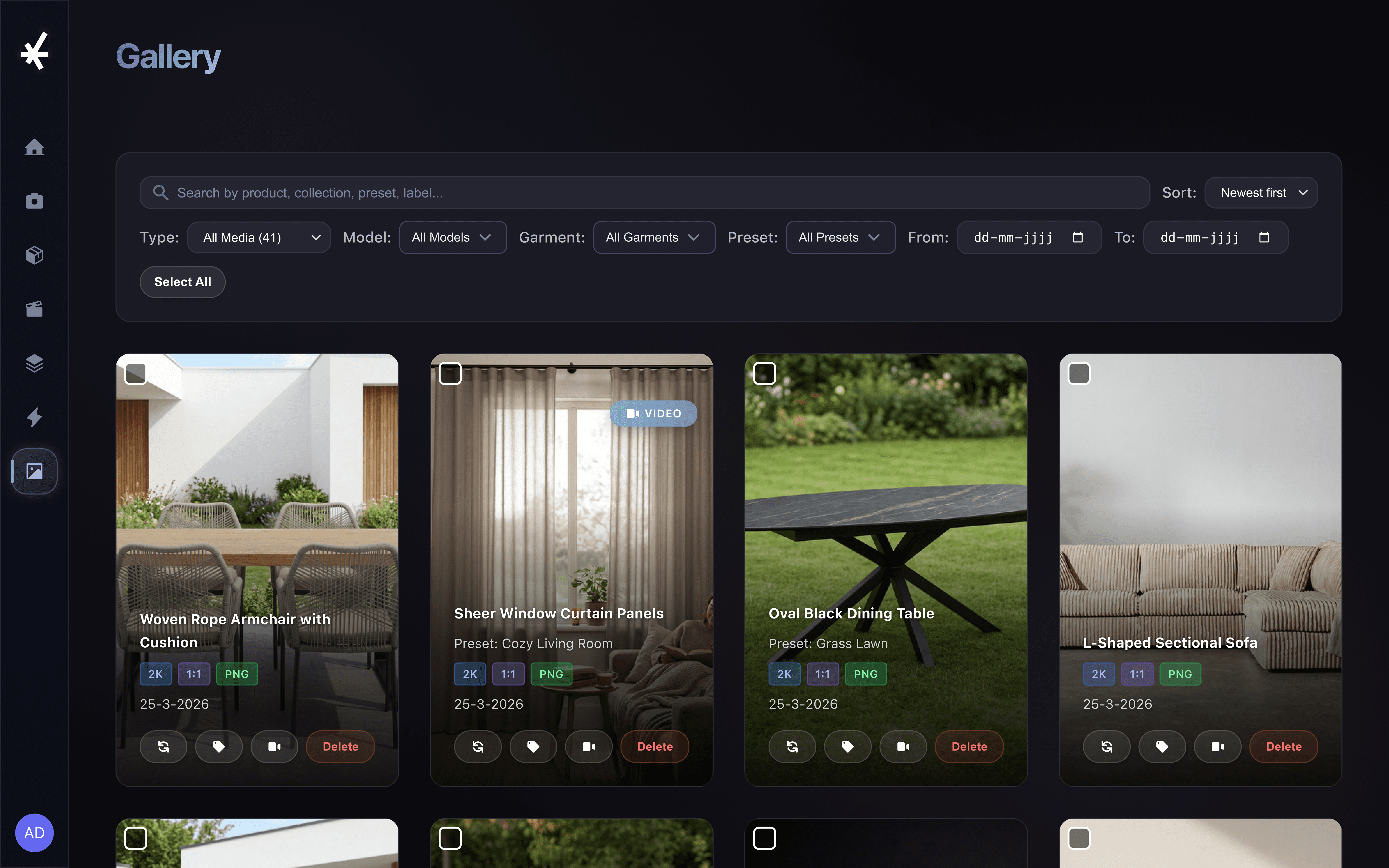 Van woonkamer tot terras, van keuken tot kinderkamer: creëer in minuten tientallen lifestylebeelden zonder locatie, stylist of model. Upload je product, kies of maak een scene, en genereer direct variaties die klaar zijn voor je shop, ads of socials.