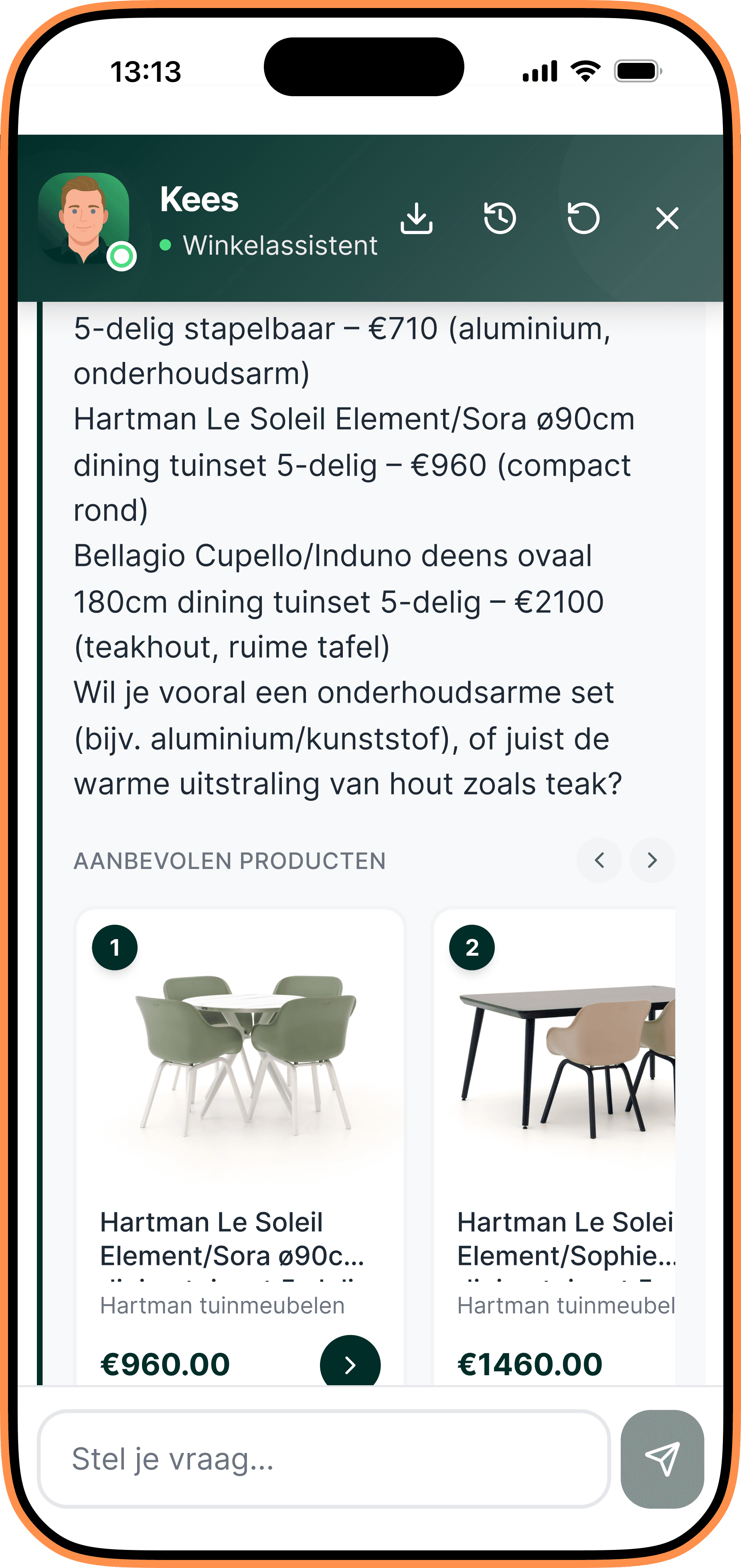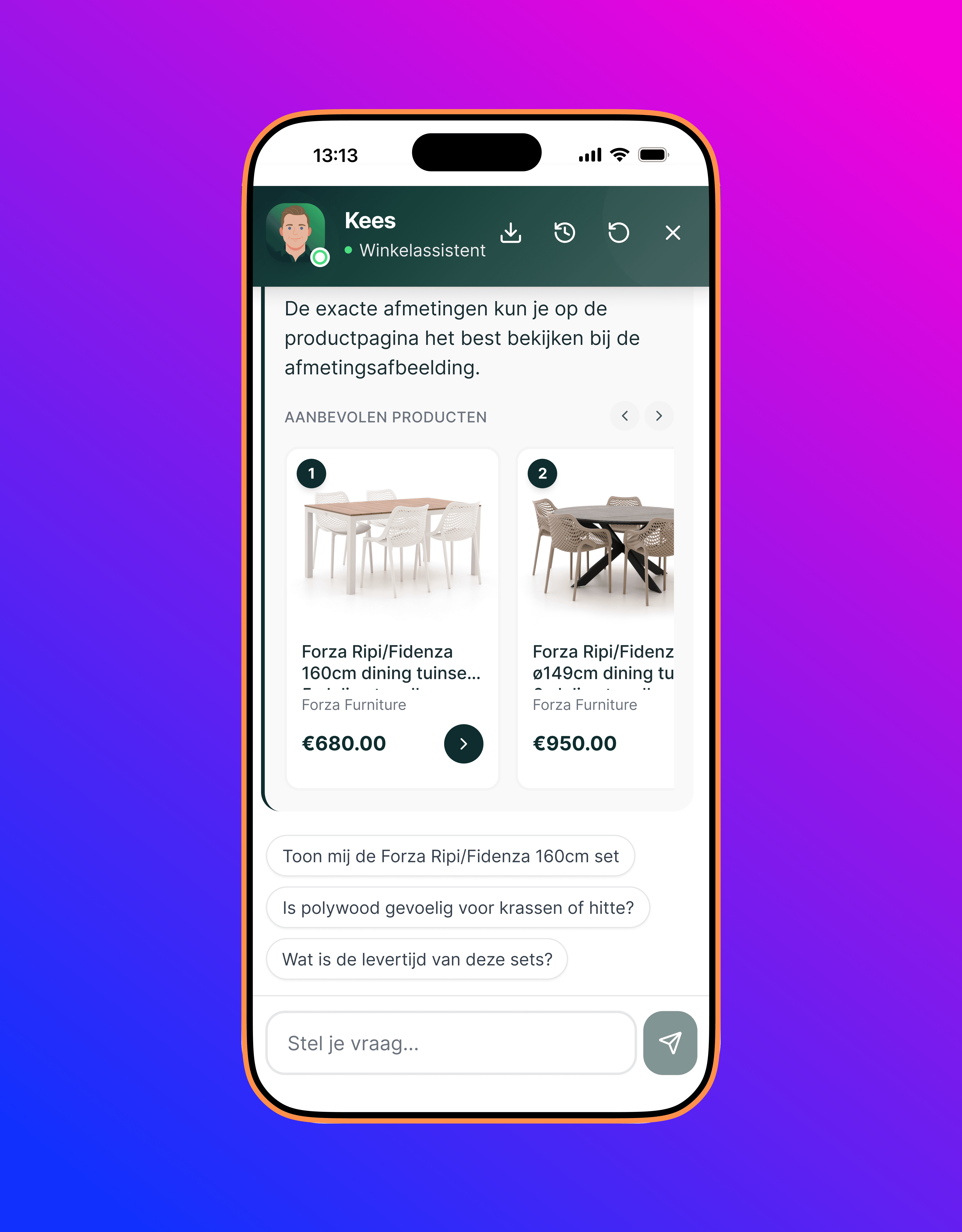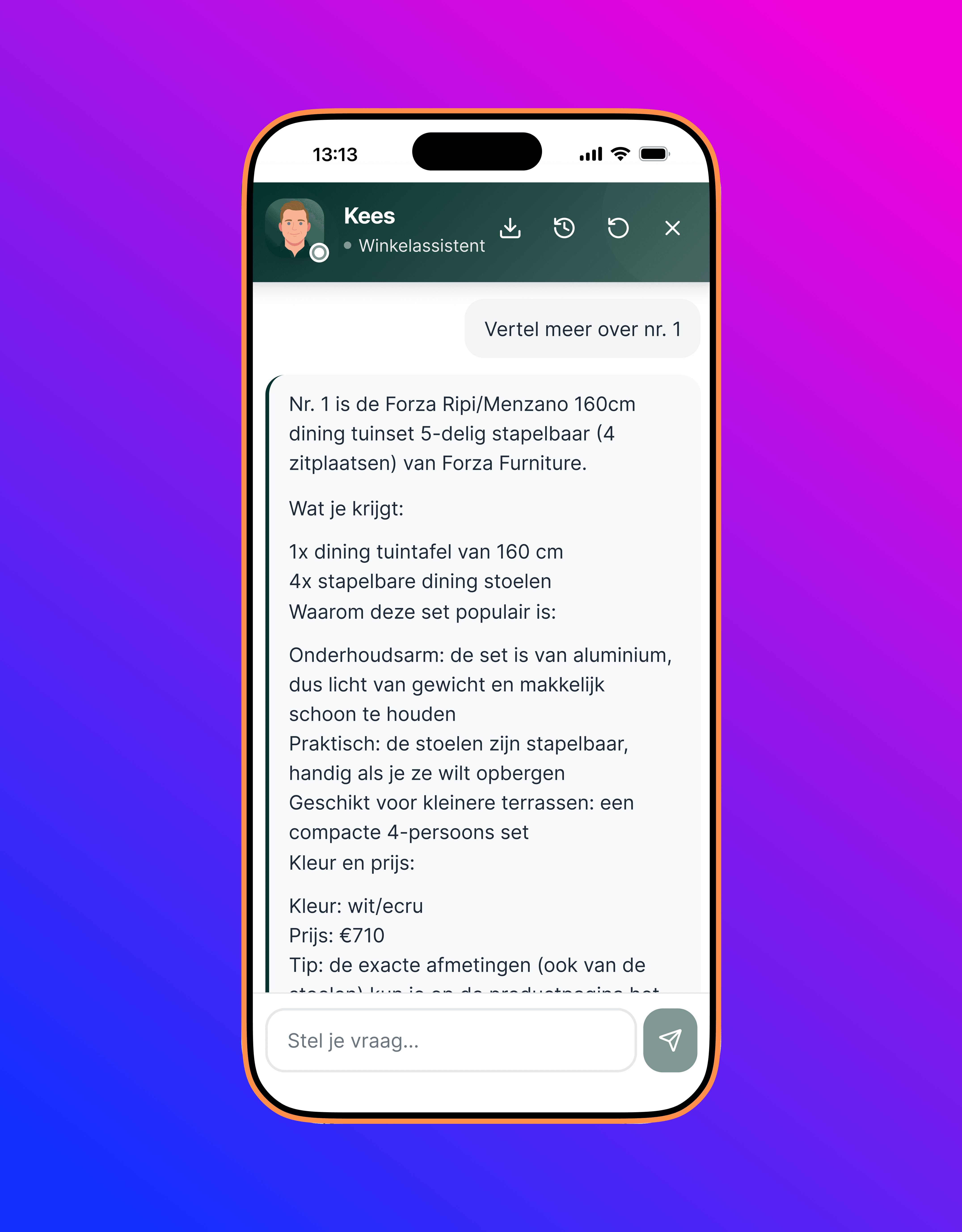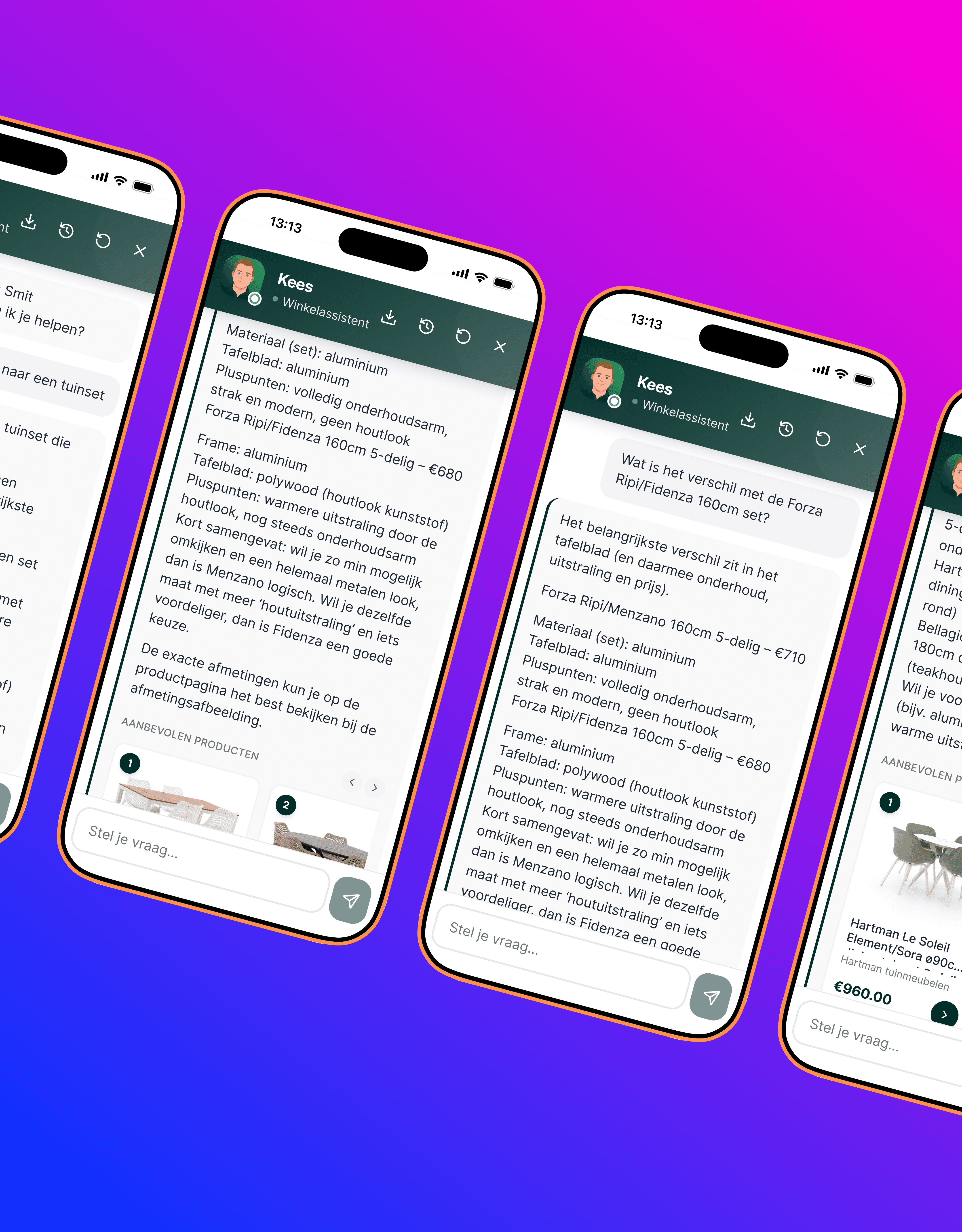 Tegelijk worden praktische vragen over specificaties, compatibiliteit, voorraad, levertijd of retouren direct beantwoord. Dat maakt de ervaring sterker én verlaagt de druk op customer support.