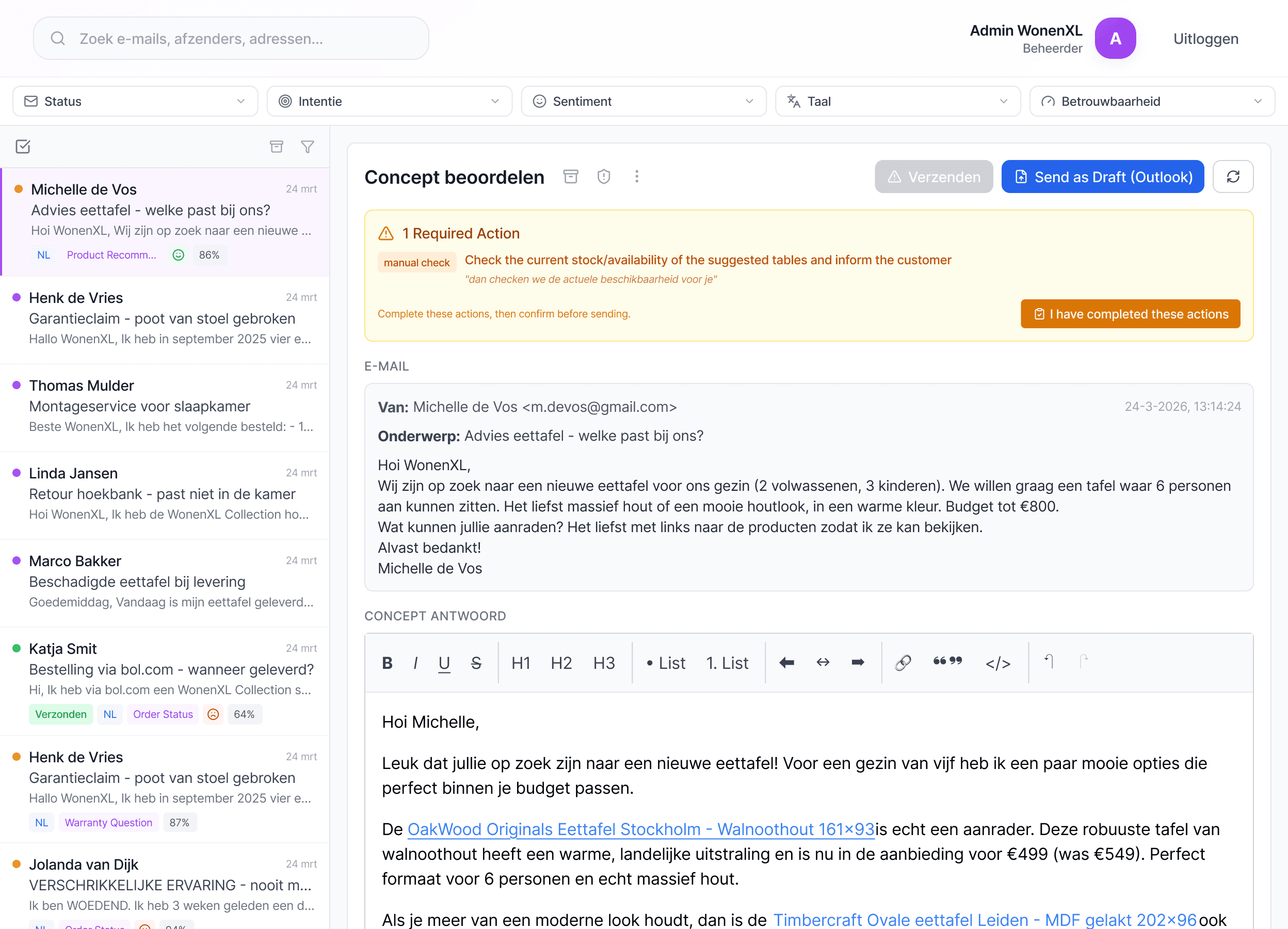 Een trackingvraag, retourverzoek of orderwijziging vraagt meer dan een standaardantwoord. Sero Support Agent haalt data op uit je systemen, volgt jouw processen en zet de juiste vervolgstappen klaar. Zo verdwijnt onnodig handwerk en krijgen klanten sneller duidelijkheid.